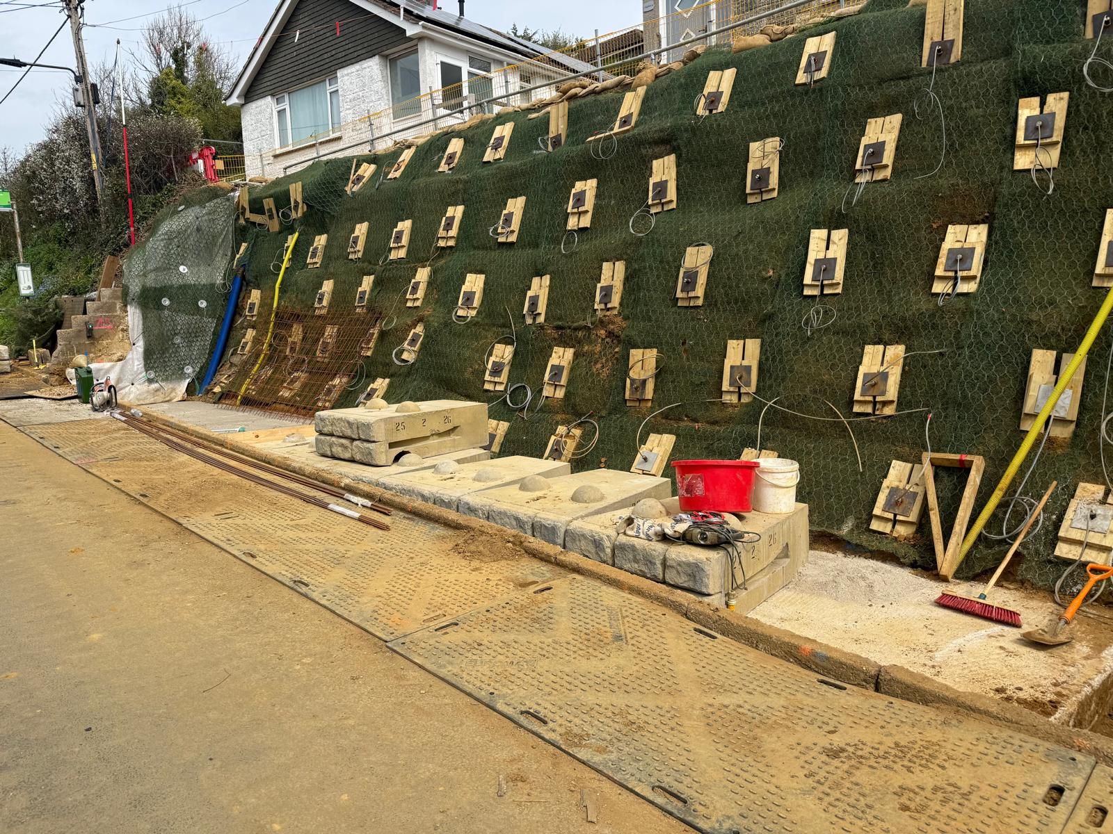 Progress has been good. As of April 10, the excavation is complete, the remaining bank has been stabilised, foundations for the new retaining wall have been laid and work is now underway to erect the blockwork.